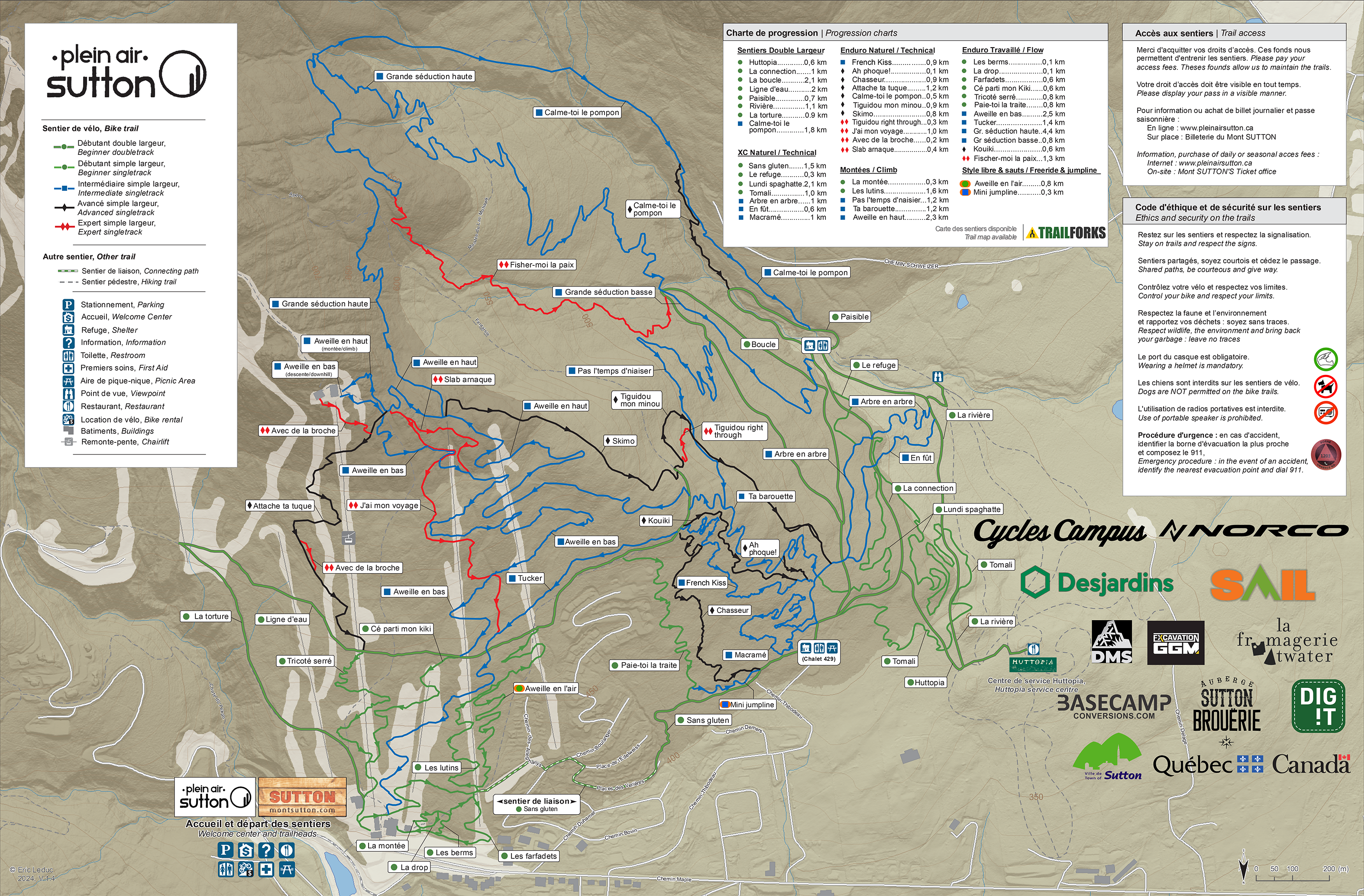 Au menu: 7 kilomètres de sentiers double-largeur, 8 kilomètres de sentier cross-country et 31 kilomètres de sentiers enduro accessibles par 4 montées. Notre réseau est également desservi par la remontée mécanique du Mont Sutton.